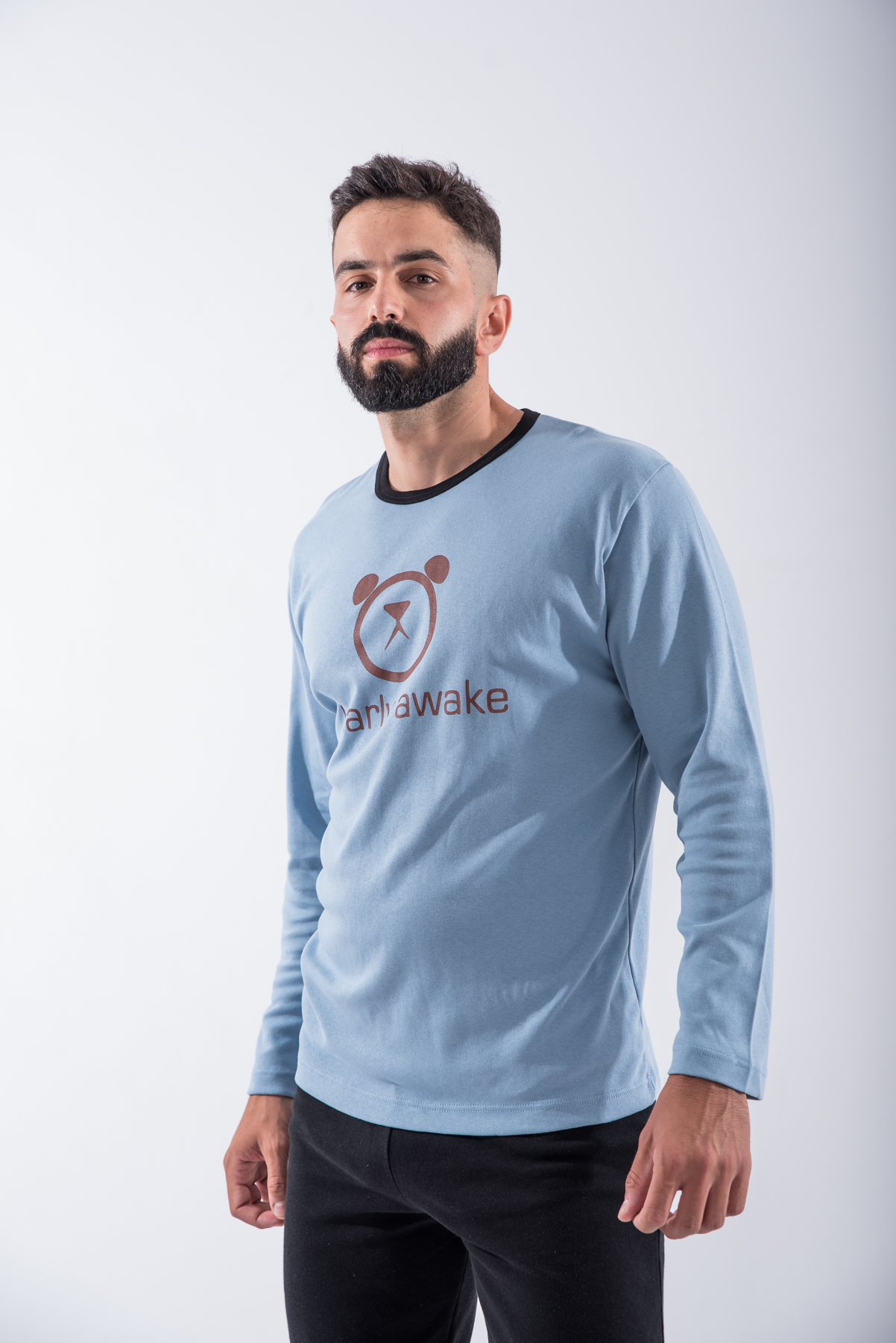 Ανδρική χειμερινή πιτζάμα από 100% βαμβακερό interlock ύφασμα. Το σετ περιλαμβάνει μακρυμάνικη μπλούζα σε γαλάζιο χρώμα με σχέδιο μπροστά και μακρύ μαύρο παντελόνι με μπάσκες στα τελειώματα.