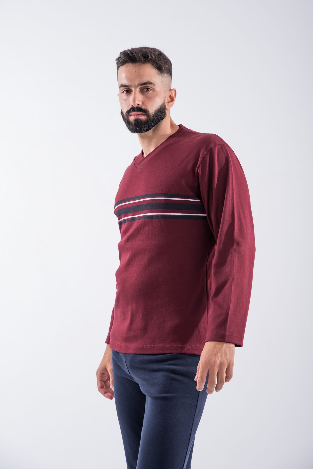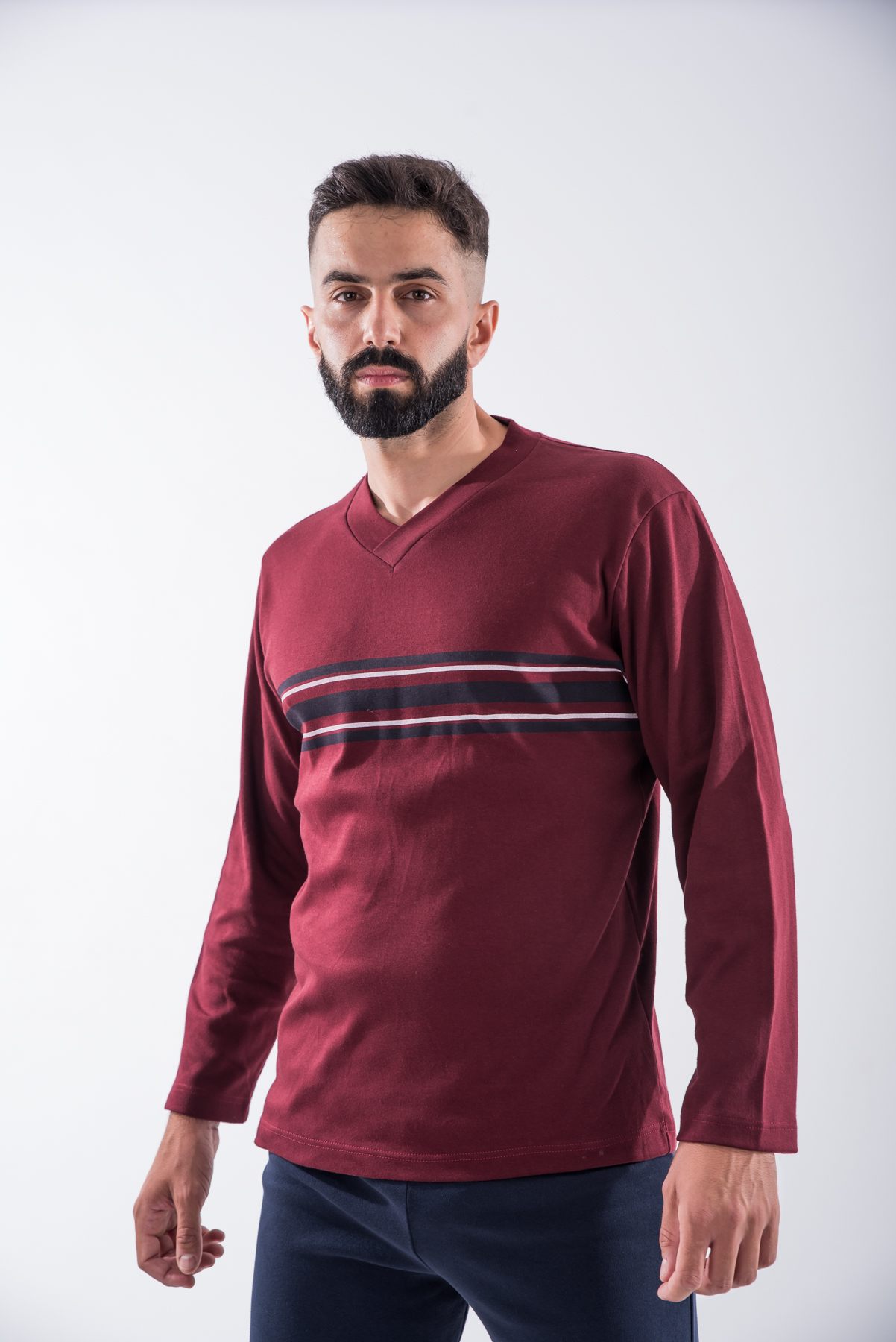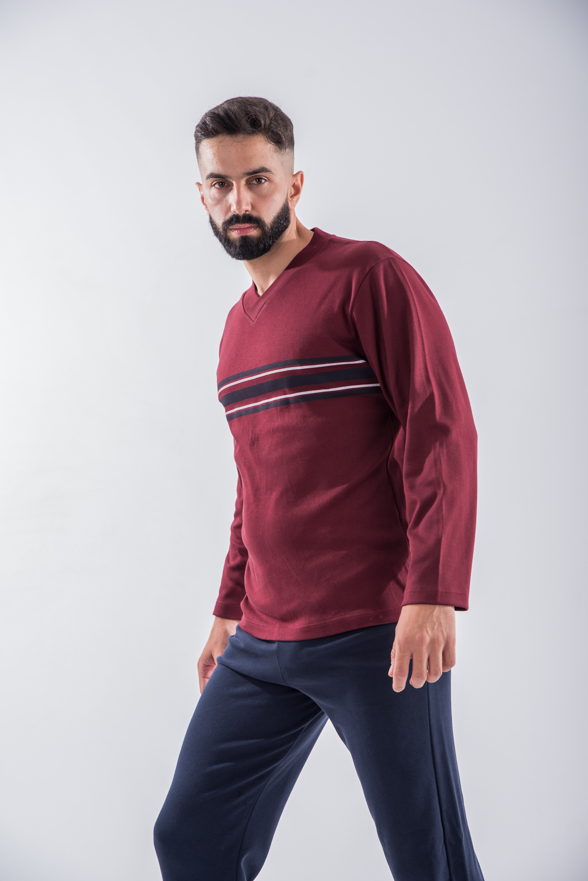Ανδρική χειμερινή πιτζάμα από 100% βαμβακερό interlock ύφασμα. Το σετ περιλαμβάνει μακρυμάνικη μπλούζα σε μπορντό χρώμα με ρίγα μπροστά και μακρύ σκούρο μπλε παντελόνι.