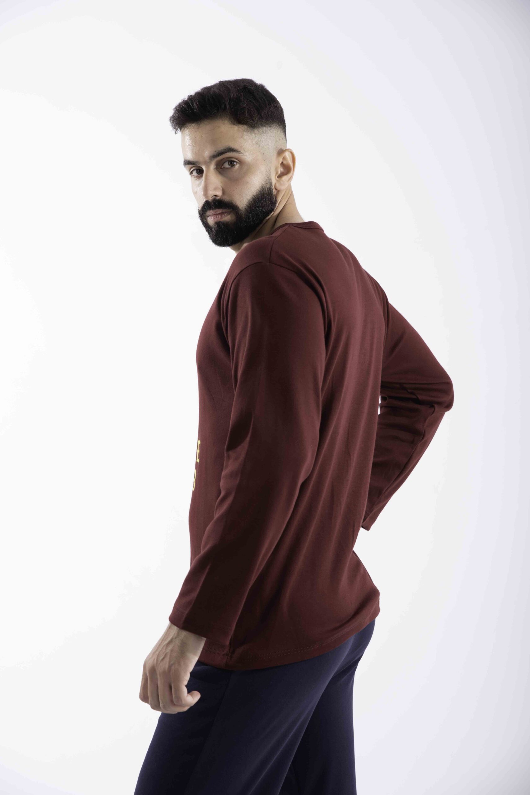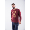 Ανδρική χειμερινή πιτζάμα από 100% βαμβακερό interlock ύφασμα. Το σετ περιλαμβάνει μακρυμάνικη μπλούζα σε μπορντό χρώμα με σχέδιο μπροστά και μακρύ μαύρο παντελόνι με μπάσκες στα τελειώματα.