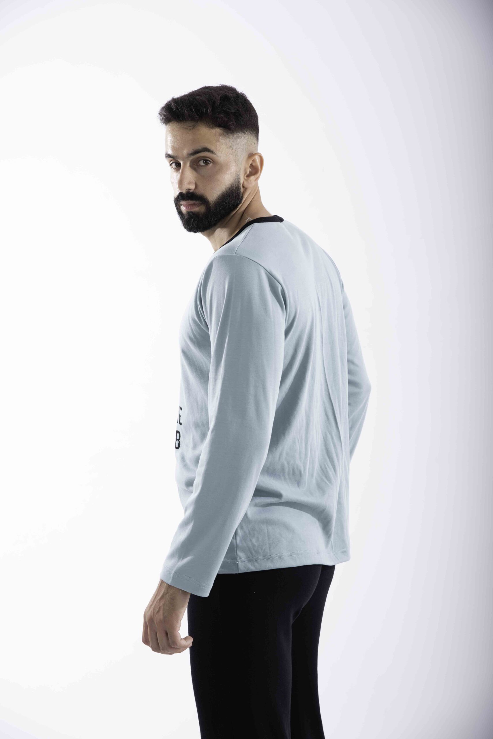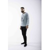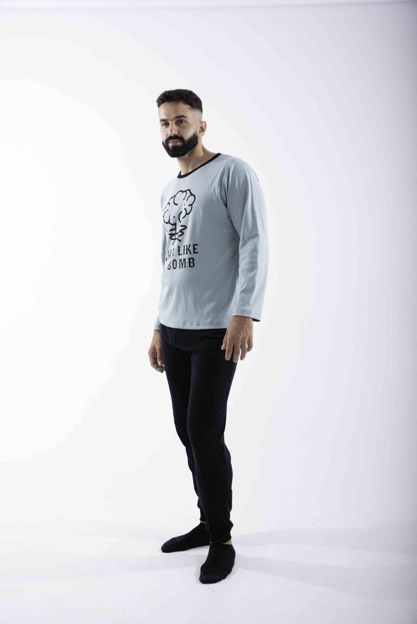 Ανδρική χειμερινή πιτζάμα από 100% βαμβακερό interlock ύφασμα. Το σετ περιλαμβάνει μακρυμάνικη μπλούζα σε γαλάζιο χρώμα με σχέδιο μπροστά και μακρύ μαύρο παντελόνι με μπάσκες στα τελειώματα.