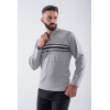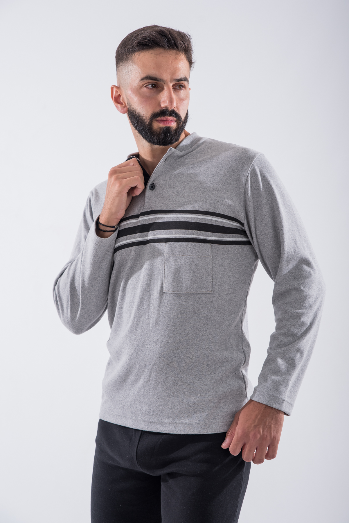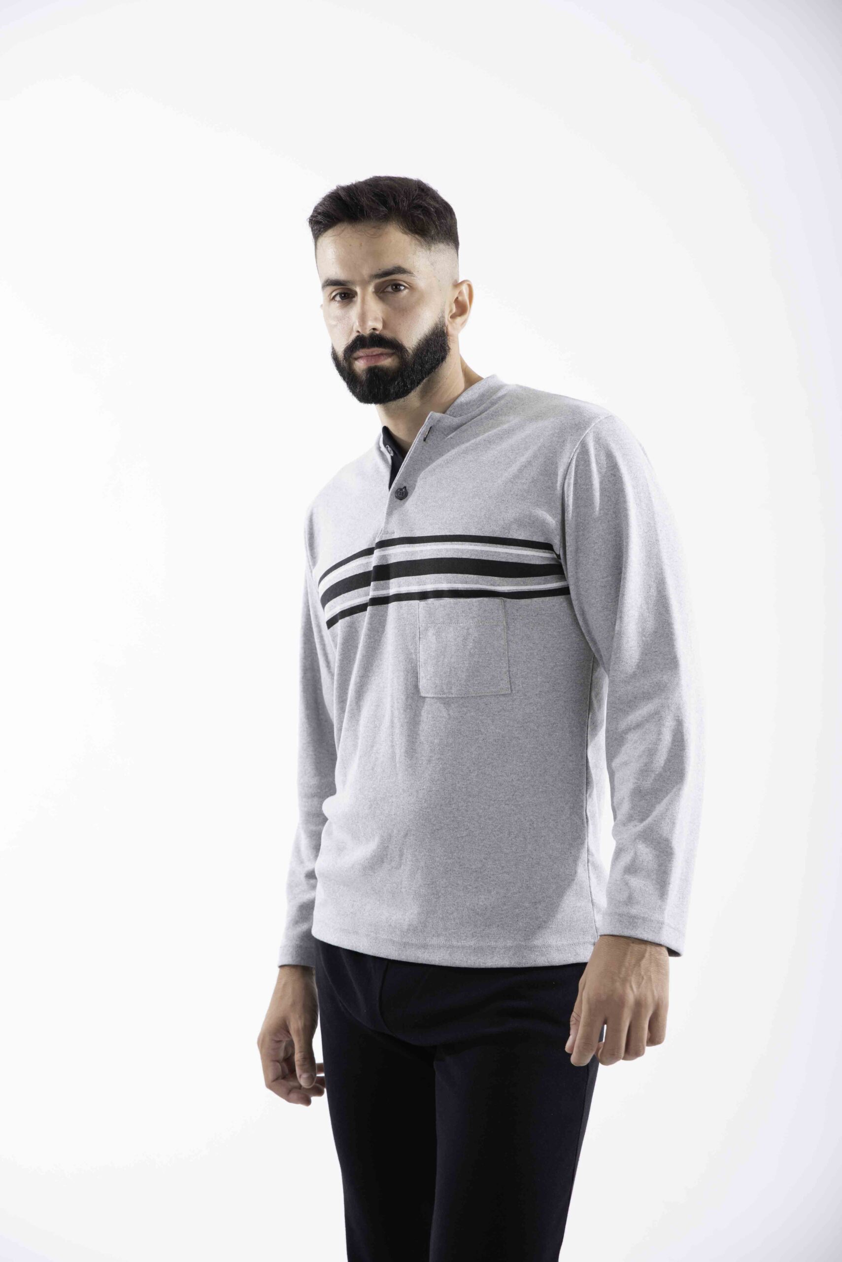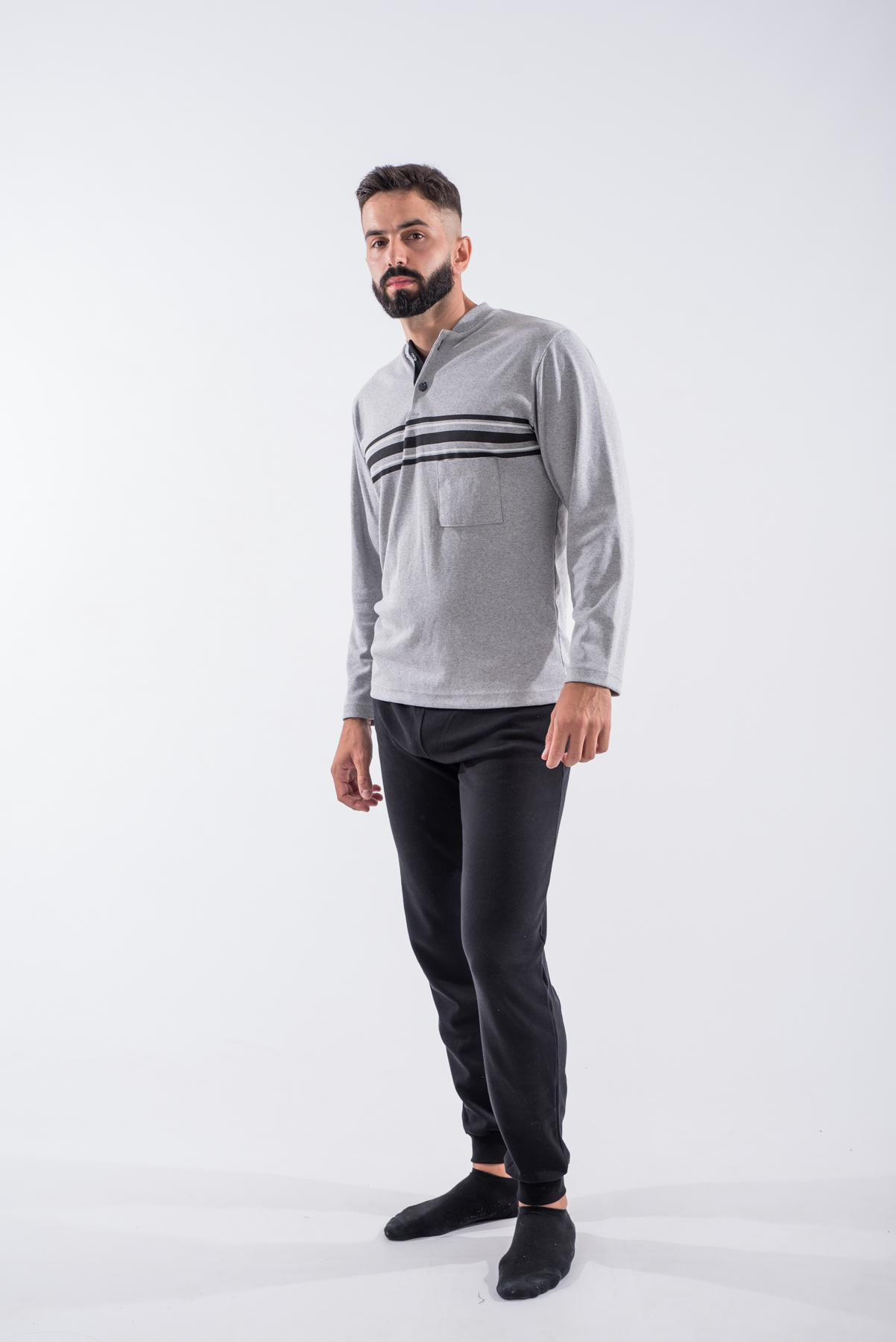 Ανδρική χειμερινή πιτζάμα από 100% βαμβακερό interlock ύφασμα. Το σετ περιλαμβάνει μακρυμάνικη μπλούζα σε γκρι χρώμα με κουμπιά και ρίγες μπροστά και μακρύ μαύρο παντελόνι με μπάσκες στα τελειώματα.