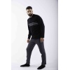 Ανδρική χειμερινή πιτζάμα από 100% βαμβακερό interlock ύφασμα. Το σετ περιλαμβάνει μακρυμάνικη μπλούζα σε μαύρο χρώμα με κουμπιά και ρίγες μπροστά και μακρύ γκρι παντελόνι.