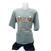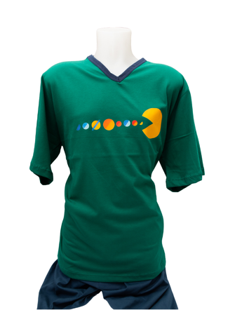 Καλοκαιρινή πράσινη πιτζάμα από 100% βαμβάκι, σε άνετη γραμμή με μπλε μακρύ παντελόνια, με στάμπα pacman στη μπλούζα κοψίματος v.
