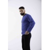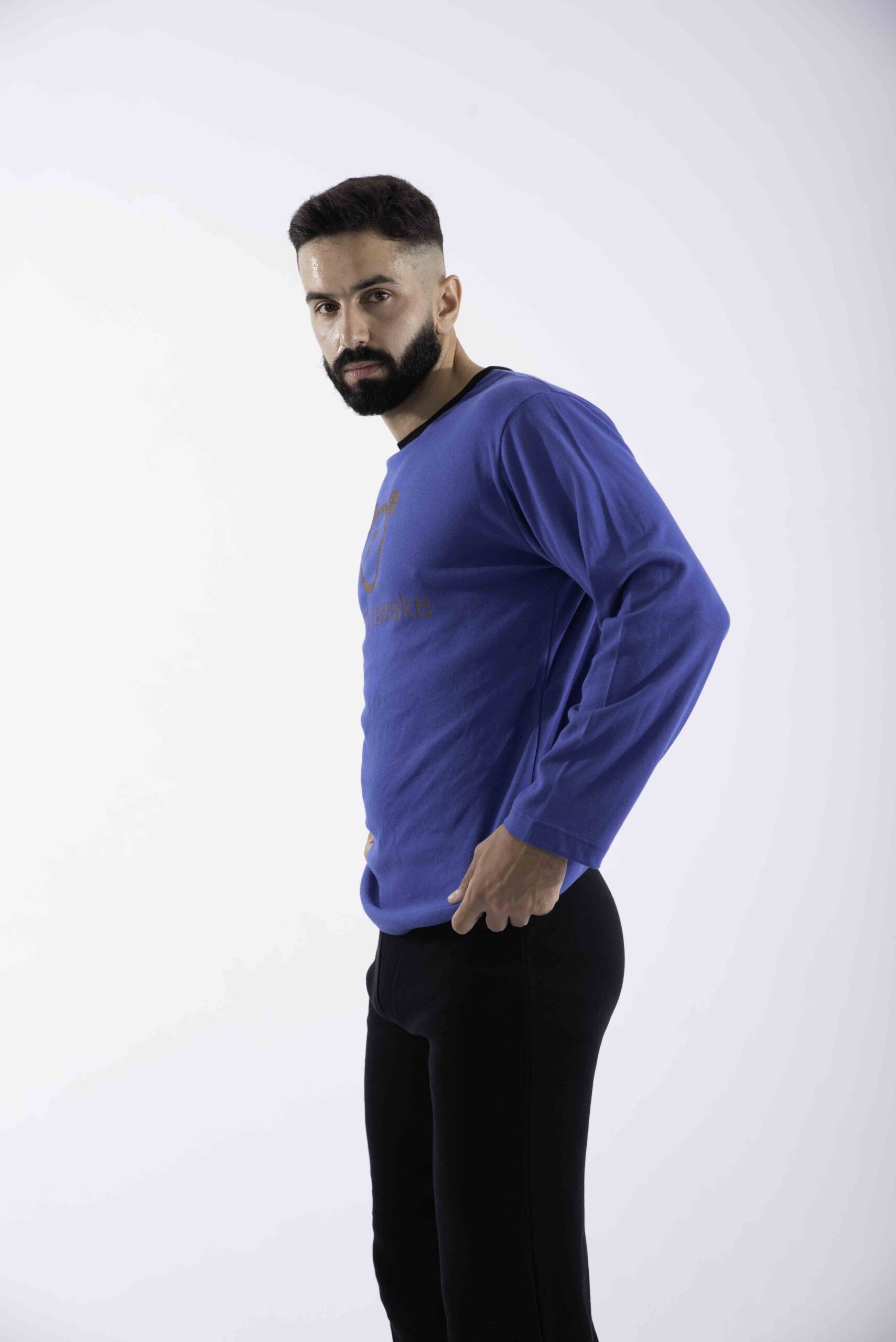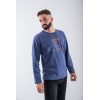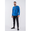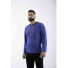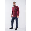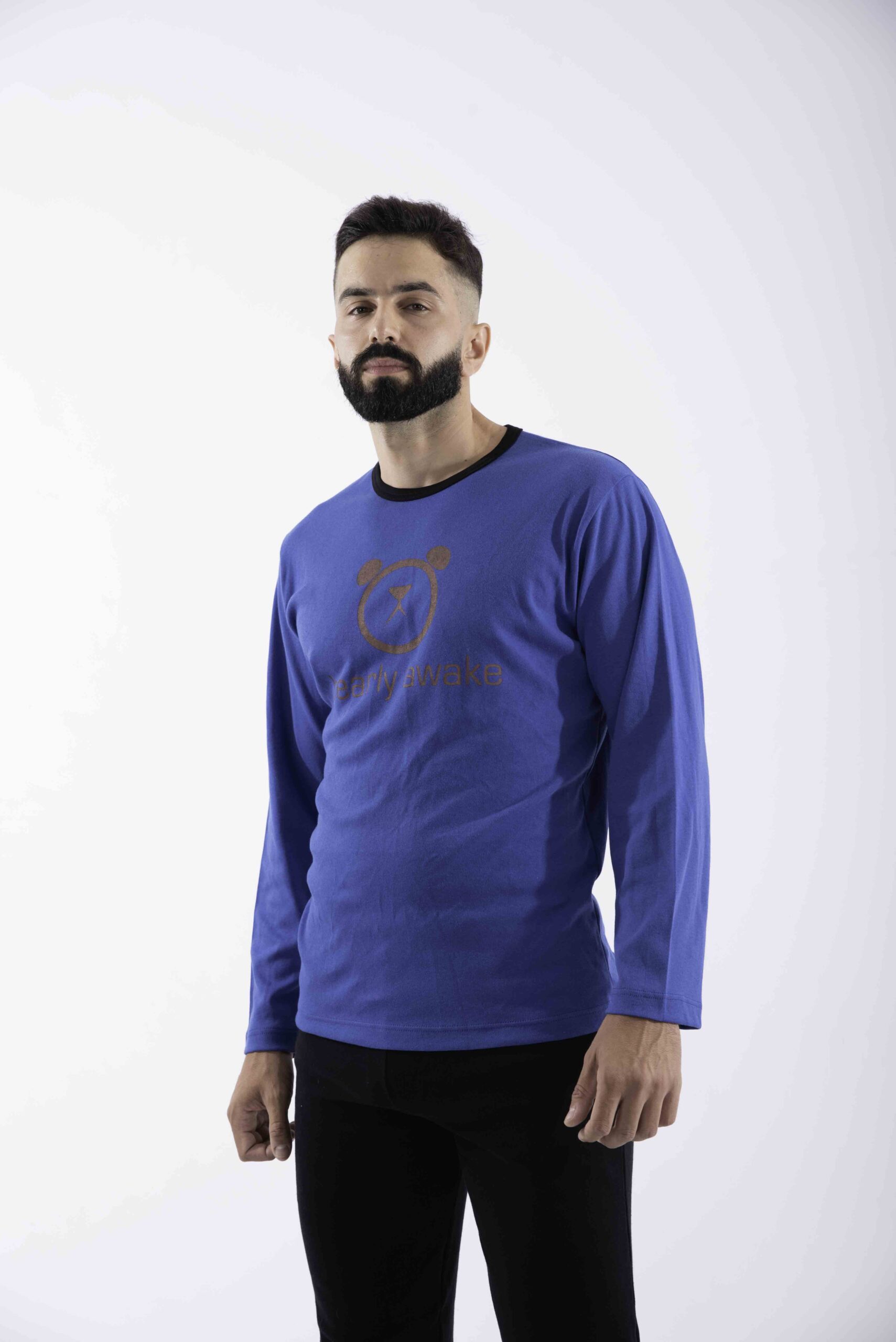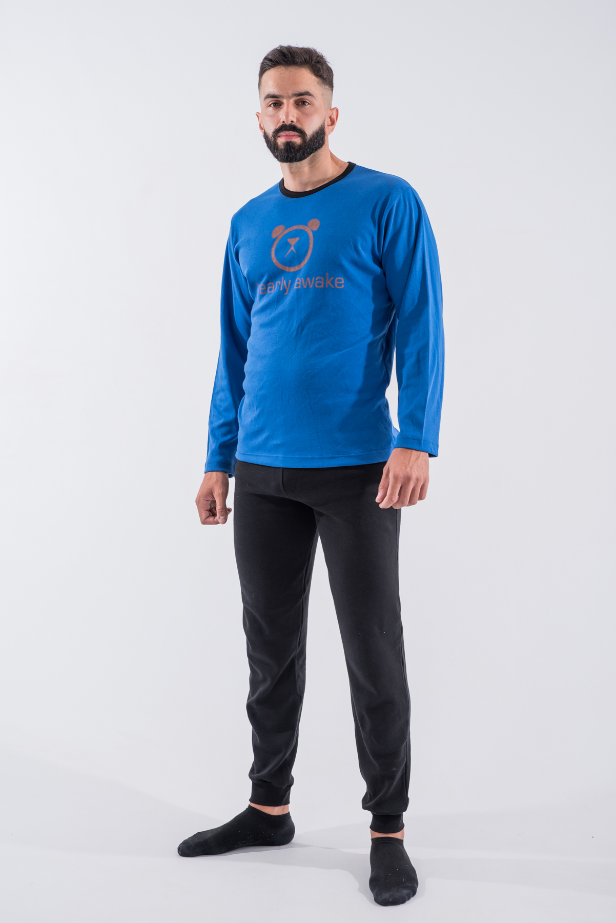 Ανδρική χειμερινή πιτζάμα από 100% βαμβακερό interlock ύφασμα. Το σετ περιλαμβάνει μακρυμάνικη μπλούζα σε μπλε χρώμα με σχέδιο μπροστά και μακρύ μαύρο παντελόνι με μπάσκες στα τελειώματα.