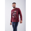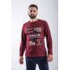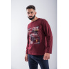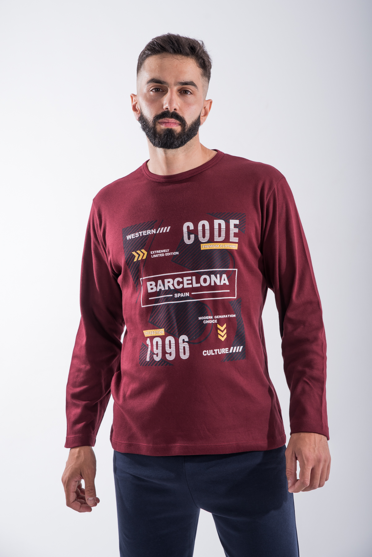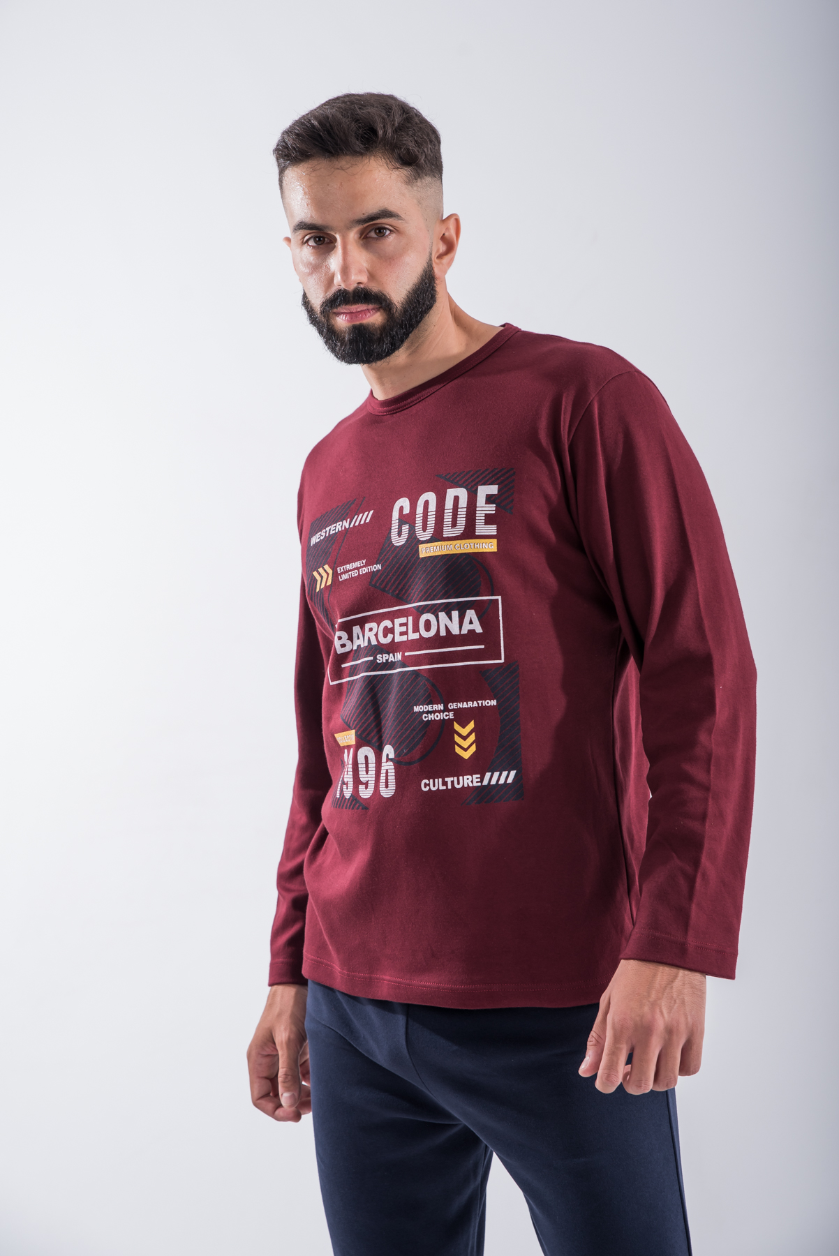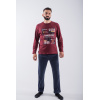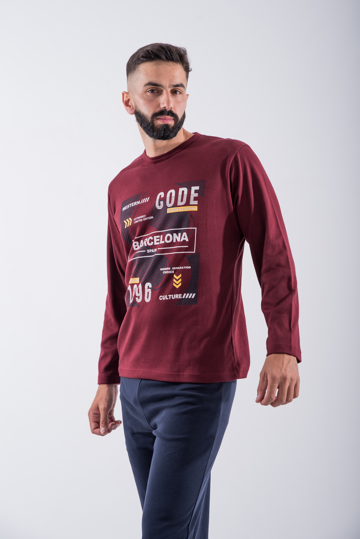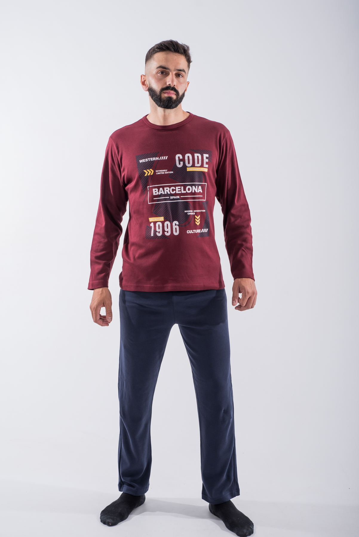 Ανδρική χειμερινή πιτζάμα από 100% βαμβακερό interlock ύφασμα. Το σετ περιλαμβάνει μακρυμάνικη μπλούζα σε μπορντό χρώμα με σχέδιο μπροστά και μακρύ σκούρο μπλε παντελόνι.