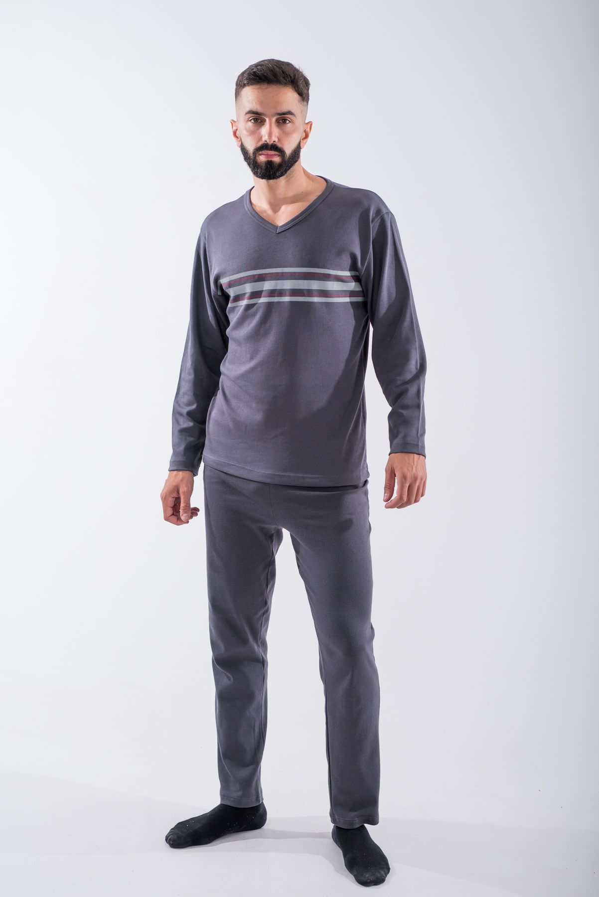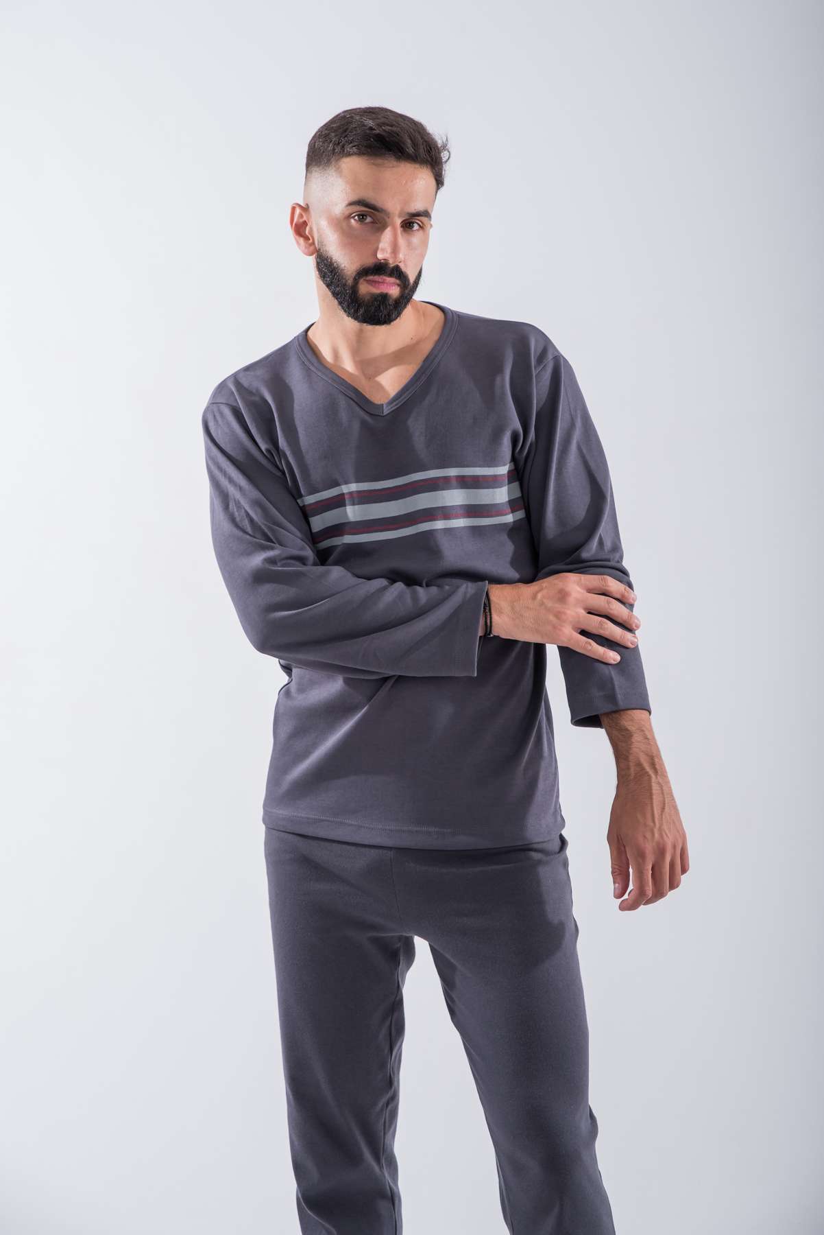 Ανδρική χειμερινή πιτζάμα από 100% βαμβακερό interlock ύφασμα. Το σετ περιλαμβάνει μακρυμάνικη μπλούζα σε γκρι χρώμα με ρίγες μπροστά και λαιμόκοψη σε σχήμα v και μακρύ μαύρο παντελόνι με μπάσκες στα τελειώματα.